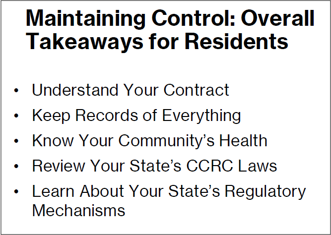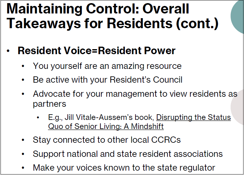 Yvonne Troya concluded the presentation by focusing on what residents can do. She spoke briefly, but her message was clear and concise. “We’re seeing a move toward ‘repayable on resale’ and away from truly refundable entrance fees,” she said. “An investment banker told me she would be surprised if any CCRCs were offering fully refundable contracts anymore.”